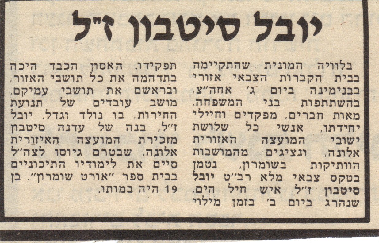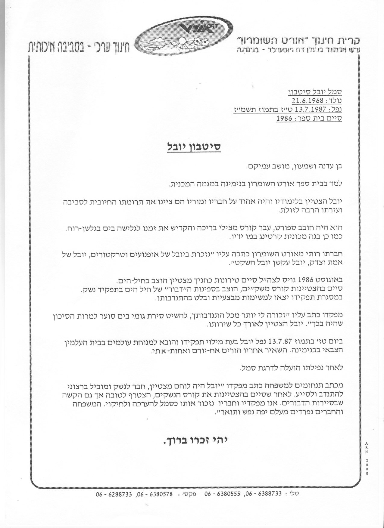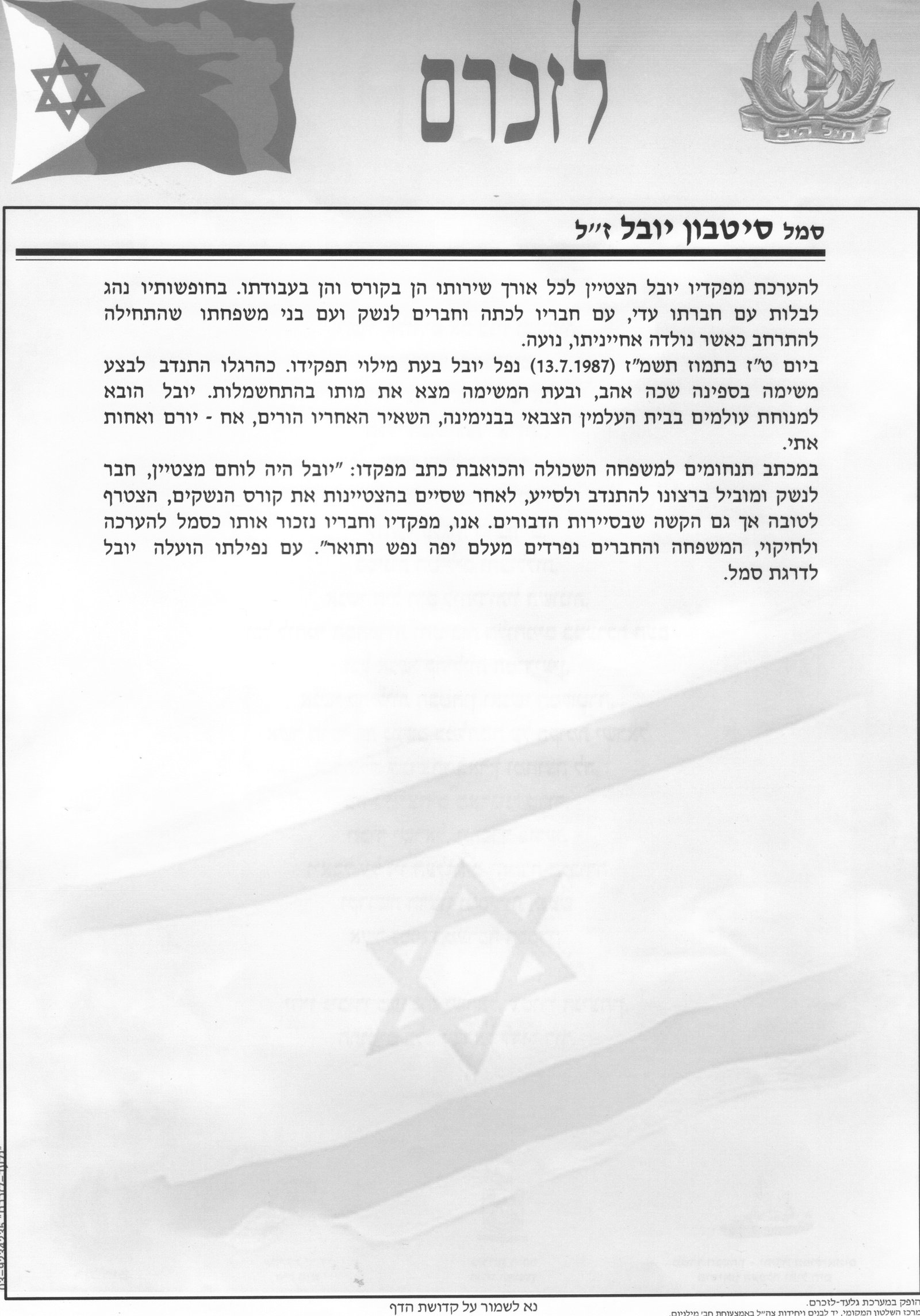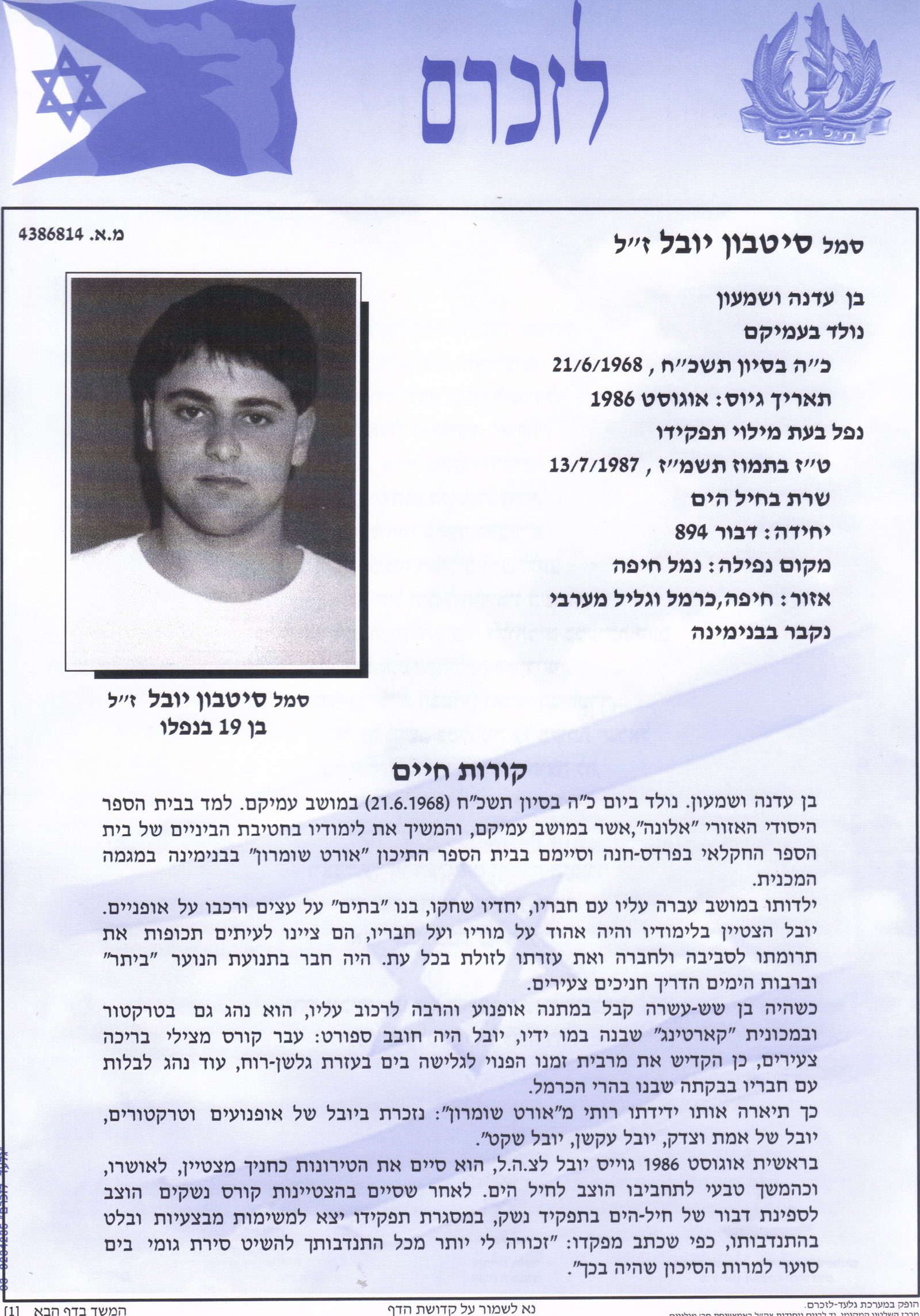דף הבית ורשימת הנופלים סיטבון יובל|תמונות מחייו|כתבו עליו|לדף הנצחה של משרד הביטחון|צרו קשר יובל סיטבון – כתבו עליו מכתב מחבר על ההלוויה על יובל אורט מודעות אבל מחיל הים 2 מחיל הים 1 דף הבית ורשימת הנופלים סיטבון יובל|תמונות מחייו|כתבו עליו|לדף הנצחה של משרד הביטחון
